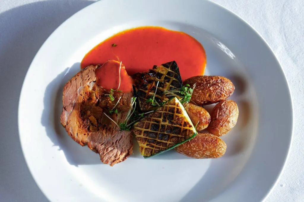Langtidsstekt svinenakke, grillet paprikasaus, ristet potet, grillet zucchini (laktosefri melk, soya)